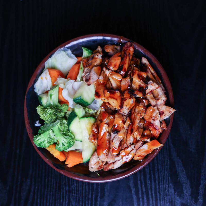 Bowl of steamed rice, topped with BBQ chicken teriyaki and steamed veggies